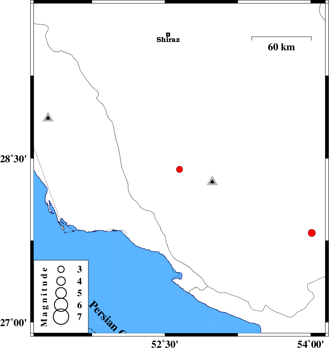 | 2010/08/24 | 12:37:15.0 | 17:07:15.0 | 28.4 | 52.65 | 15 | ML3 | Fars Province, 38 km West of Qir va Karzin | ||