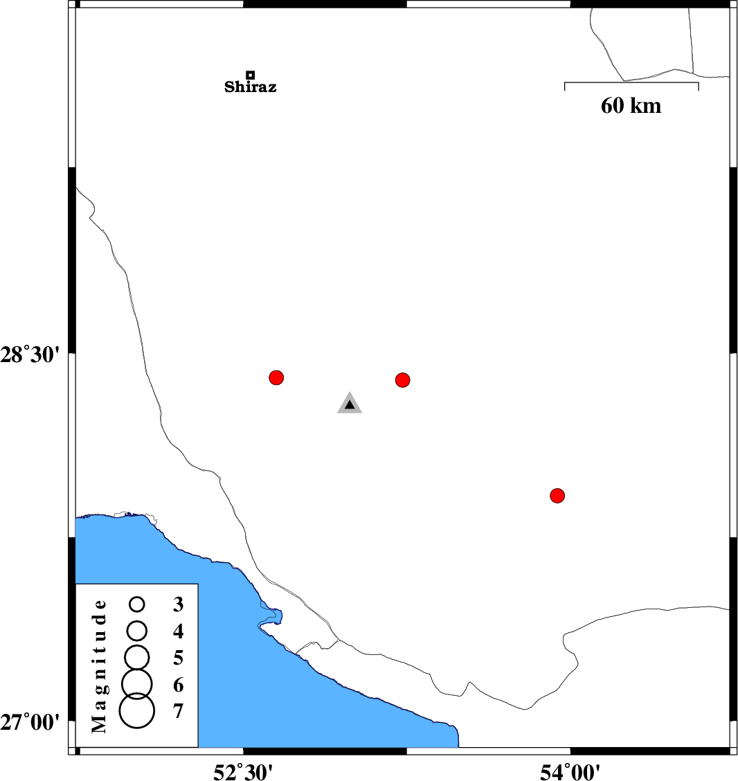 | 2010/08/24 | 12:37:15.0 | 17:07:15.0 | 28.4 | 52.65 | 15 | ML3 | Fars Province, 38 km West of Qir va Karzin |