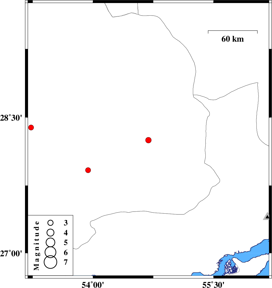 | 2010/08/25 | 01:16:49.6 | 05:46:49.6 | 27.92 | 53.94 | 30 | ML3 | Fars Province, 47 km North-West of Lar |