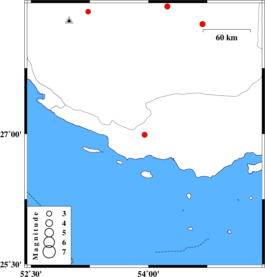 | 2010/09/03 | 03:17:53.2 | 07:47:53.2 | 26.99 | 53.95 | 14 | ML3.1 | Hormozgan Province, 47 km South-West of Bastak | ||
