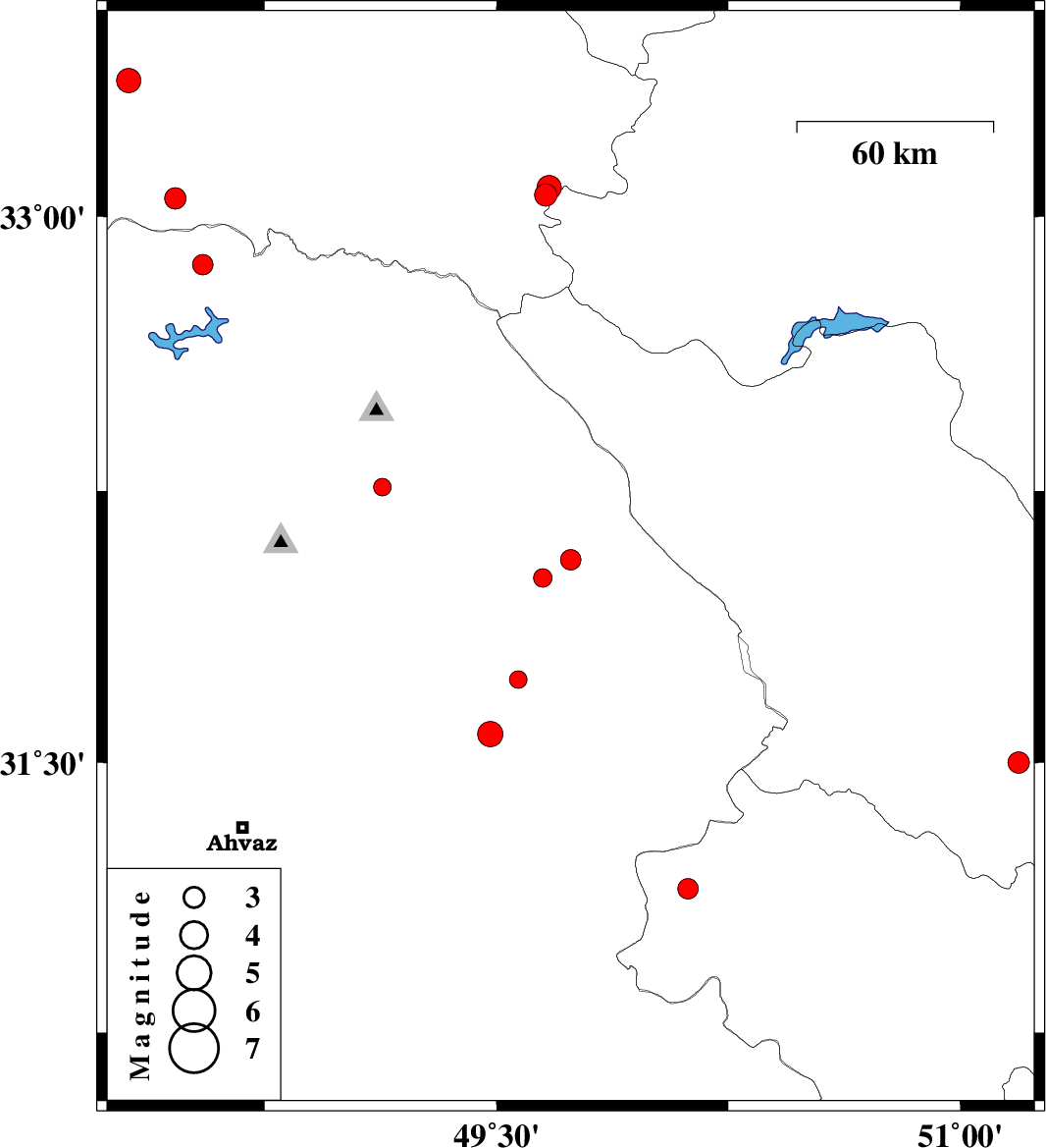 | 2010/08/09 | 19:49:24.9 | 00:19:24.9 | 33.37 | 48.31 | 44 | ML3.5 | Lorestan Province, 14 km South of Khorramabad | ||