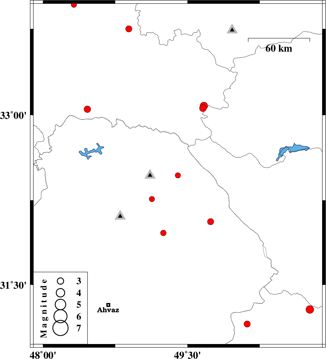 | 2010/08/21 | 01:50:30.1 | 06:20:30.1 | 32.26 | 49.13 | 14 | ML2.5 | Khoozestan Province, 14 km South of Lali | ||