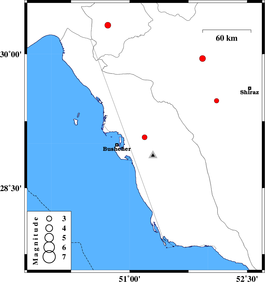 | 2010/09/20 | 08:21:50.4 | 12:51:50.4 | 29.07 | 51.19 | 17 | ML2.9 | Bushehr Province, 21 km South of Borazjan | ||