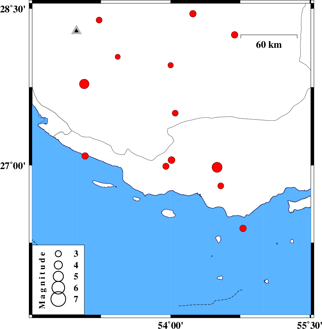 | 2010/09/07 | 02:11:04.3 | 06:41:04.3 | 26.98 | 54.5 | 31 | ML4.9 | Hormozgan Province, 27 km South-East of Bastak | ||