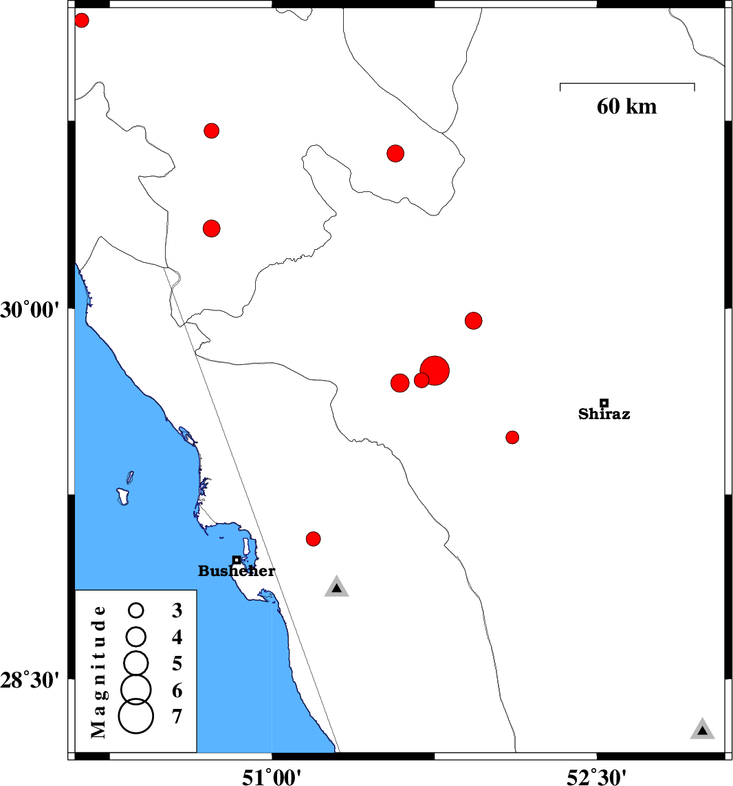 | 2010/09/20 | 08:21:50.4 | 12:51:50.4 | 29.07 | 51.19 | 17 | ML2.9 | Bushehr Province, 21 km South of Borazjan | ||