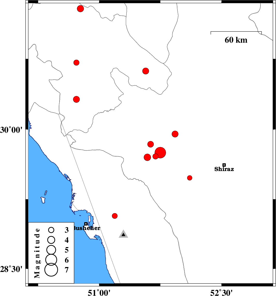 | 2010/09/20 | 08:21:50.4 | 12:51:50.4 | 29.07 | 51.19 | 17 | ML2.9 | Bushehr Province, 21 km South of Borazjan | ||