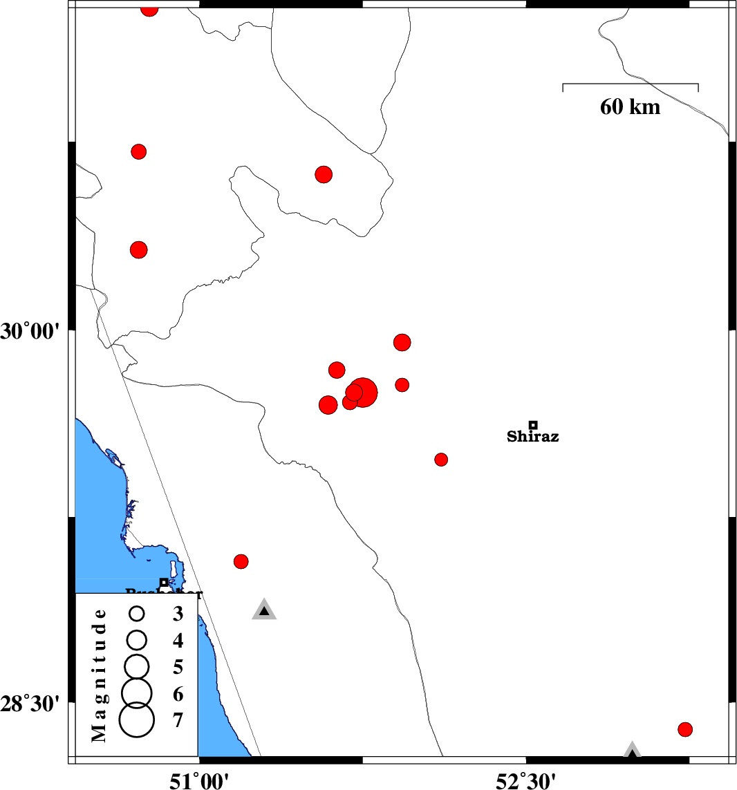 | 2010/09/20 | 08:21:50.4 | 12:51:50.4 | 29.07 | 51.19 | 17 | ML2.9 | Bushehr Province, 21 km South of Borazjan | ||