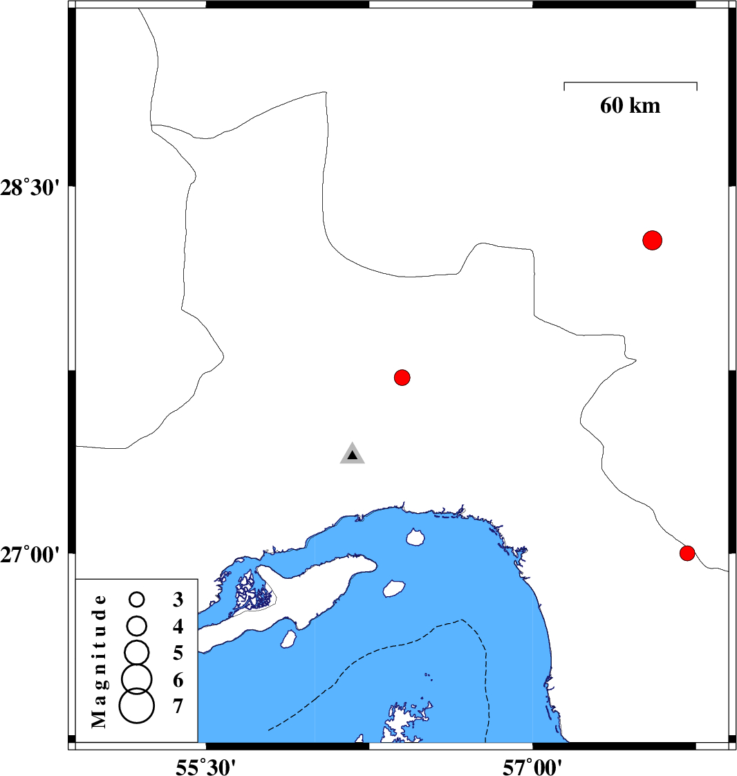 | 2010/09/26 | 07:28:38.6 | 10:58:38.6 | 28.28 | 57.55 | 15 | ML3.9 | Kerman Province, 40 km North-West of Kahnuj |