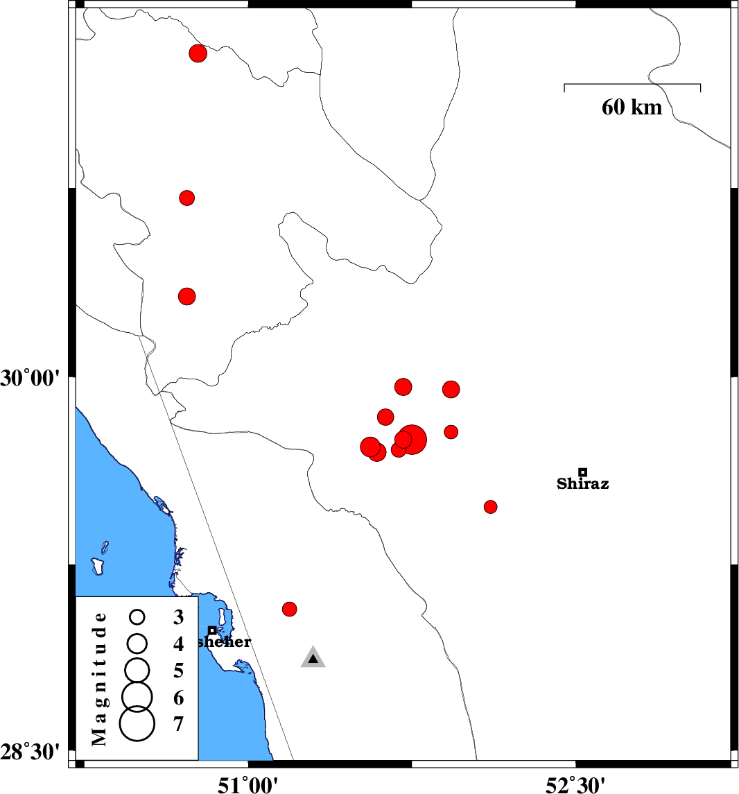 | 2010/09/20 | 08:21:50.4 | 12:51:50.4 | 29.07 | 51.19 | 17 | ML2.9 | Bushehr Province, 21 km South of Borazjan | ||