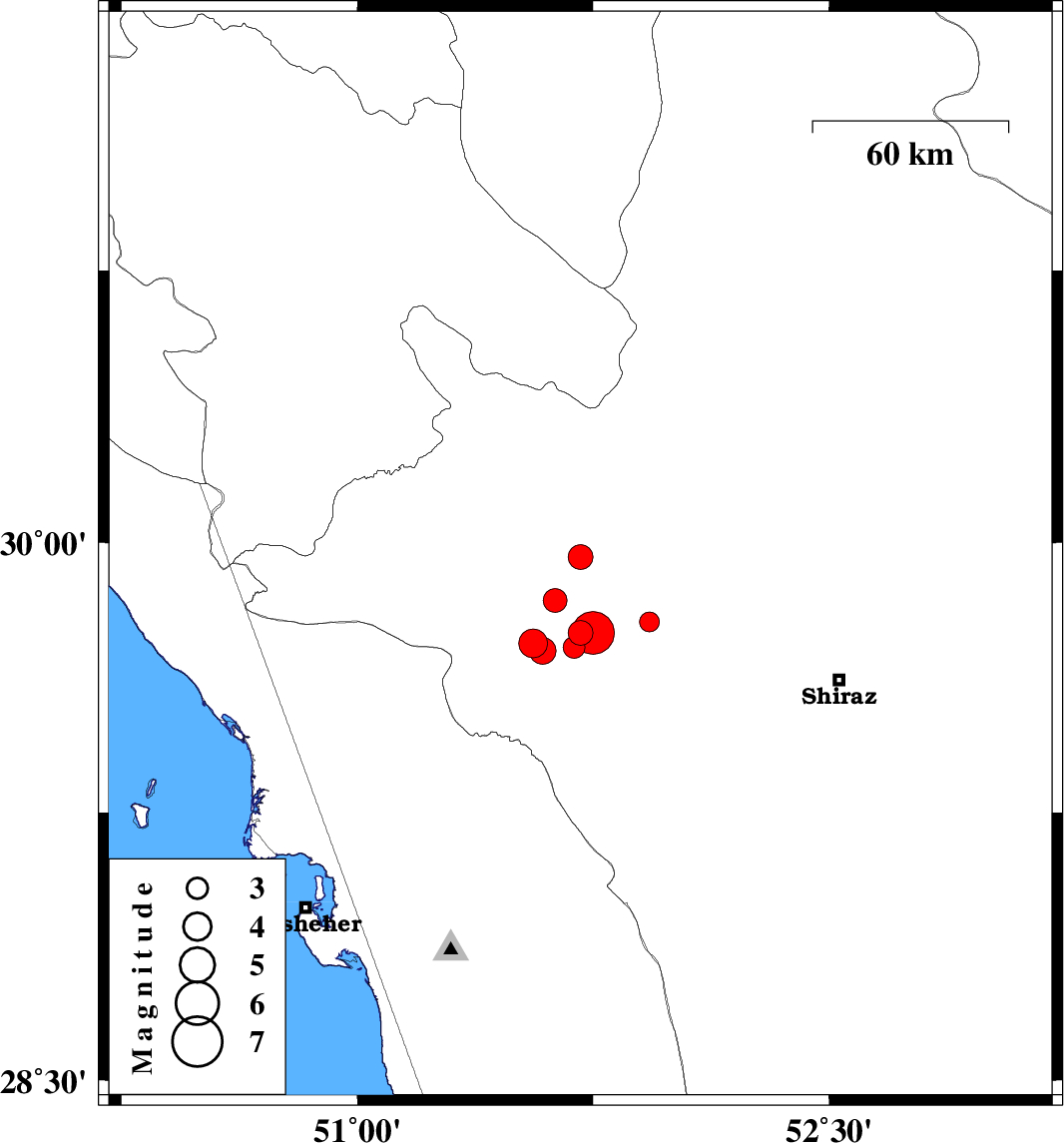 | 2010/09/27 | 11:22:44.6 | 14:52:44.6 | 29.75 | 51.75 | 15 | ML6 | Fars Province, 17 km North of Kazerun |