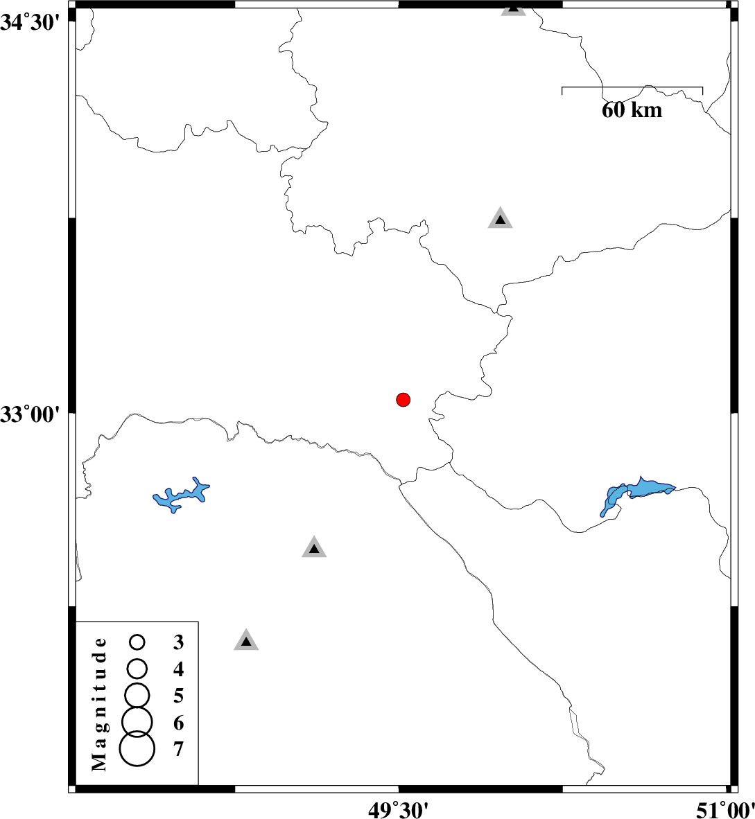 | 2010/10/06 | 07:54:04.1 | 11:24:04.1 | 33.05 | 49.52 | 17 | ML2.8 | Lorestan Province, 46 km South of Azna | ||