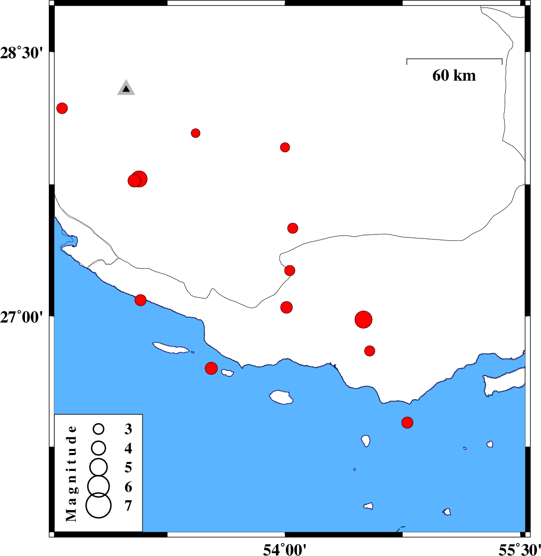 | 2010/09/27 | 05:53:42.5 | 09:23:42.5 | 26.7 | 53.53 | 46 | ML3.5 | Persian Gulf, 79 km South-East of Lamerd | ||