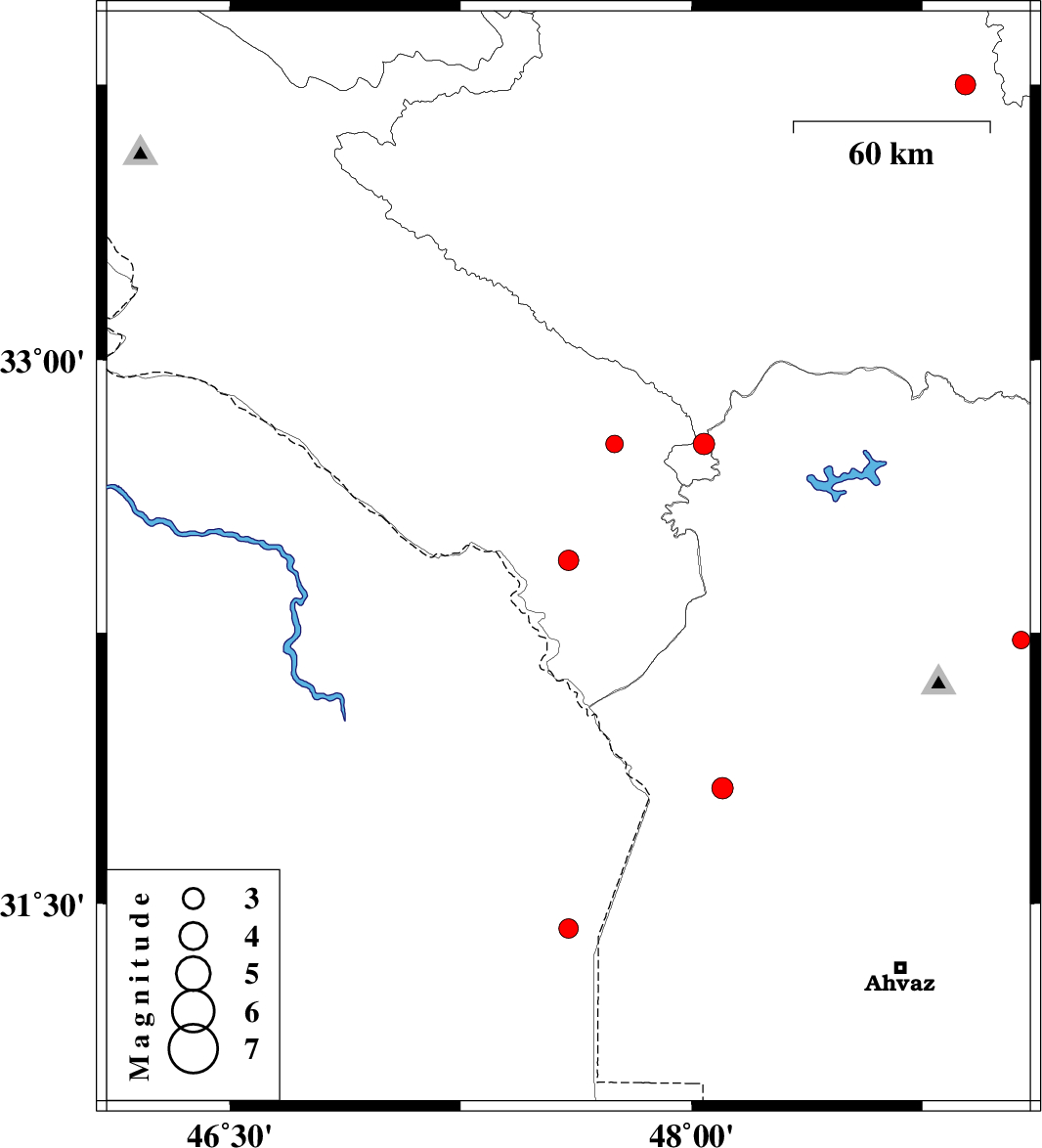 | 2010/10/07 | 07:58:53.0 | 11:28:53.0 | 32.45 | 47.6 | 14 | ML3 | Ilam Province, 42 km South-East of Dehloran | ||