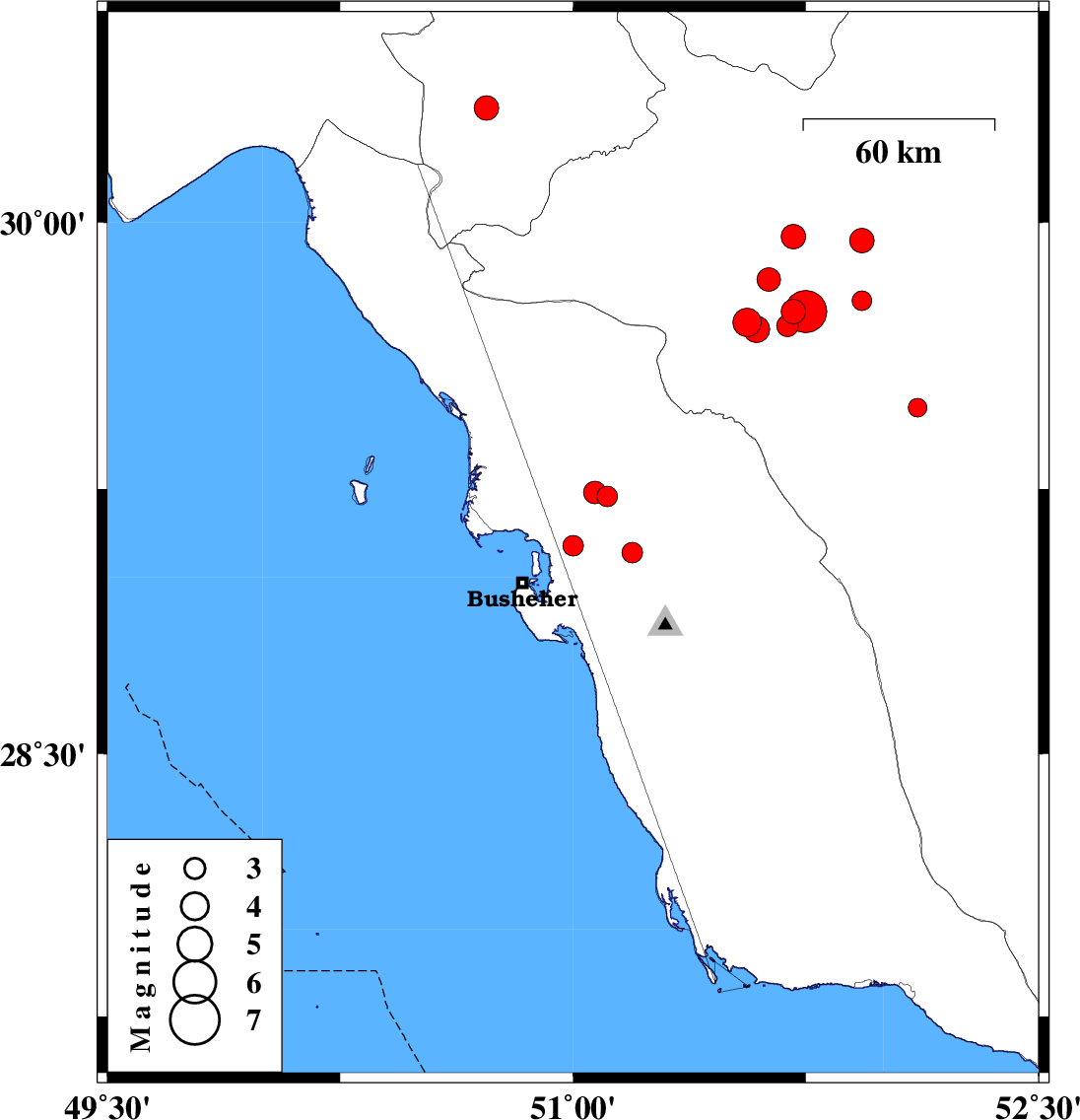 | 2010/10/08 | 22:28:57.1 | 01:58:57.1 | 29.09 | 51 | 30 | ML2.9 | Bushehr Province, 20 km North-East of Busheher | ||