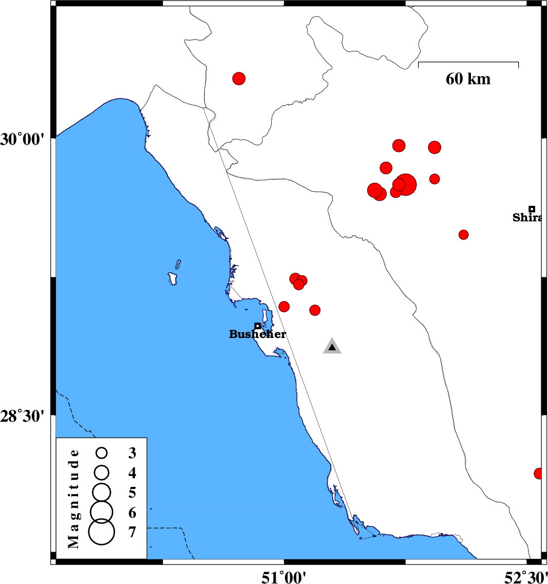 | 2010/10/08 | 22:28:57.1 | 01:58:57.1 | 29.09 | 51 | 30 | ML2.9 | Bushehr Province, 20 km North-East of Busheher | ||
