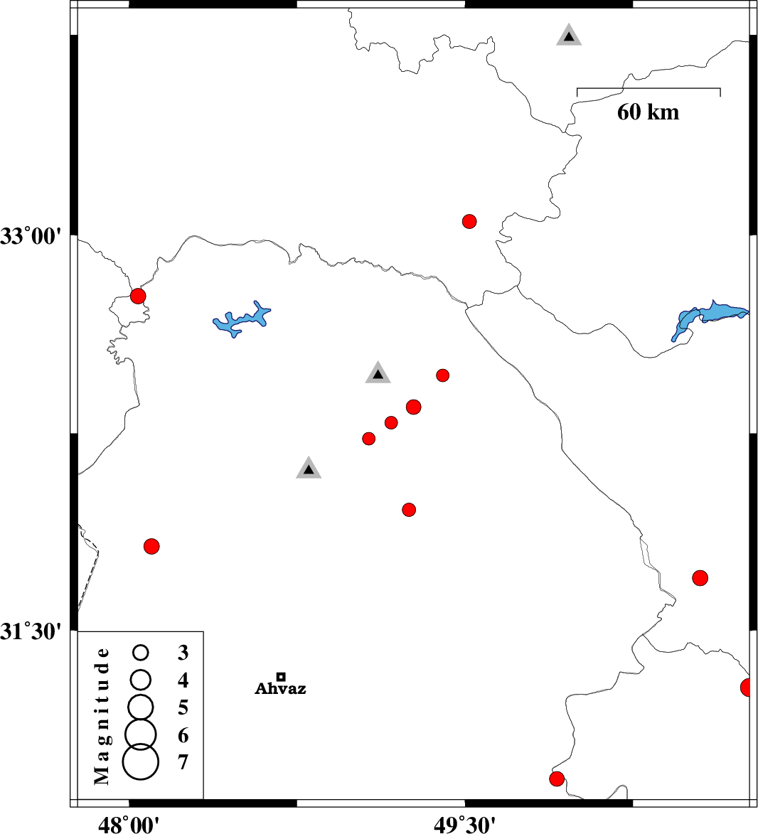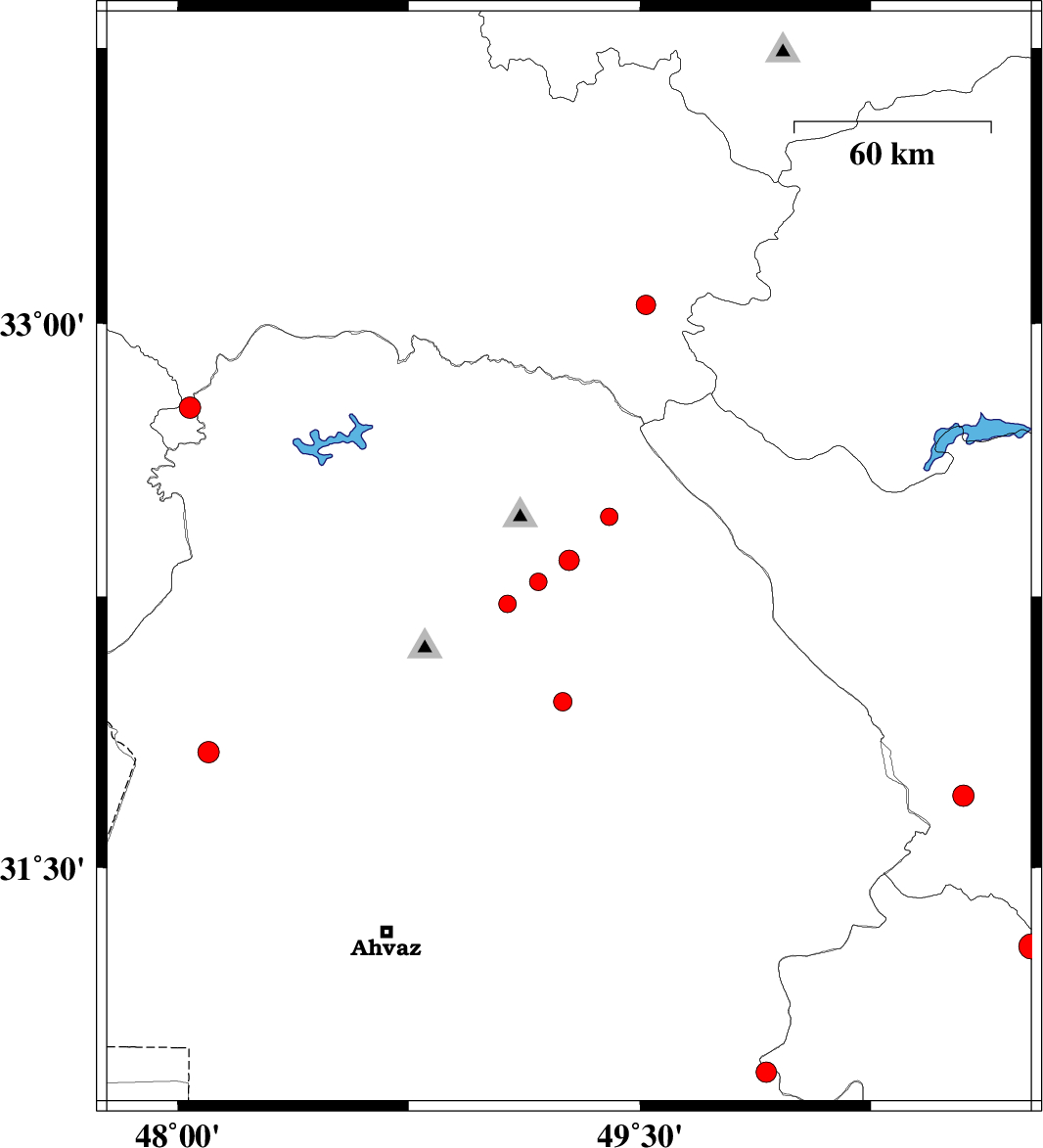 | 2010/10/06 | 07:54:04.1 | 11:24:04.1 | 33.05 | 49.52 | 17 | ML2.8 | Lorestan Province, 46 km South of Azna | ||
