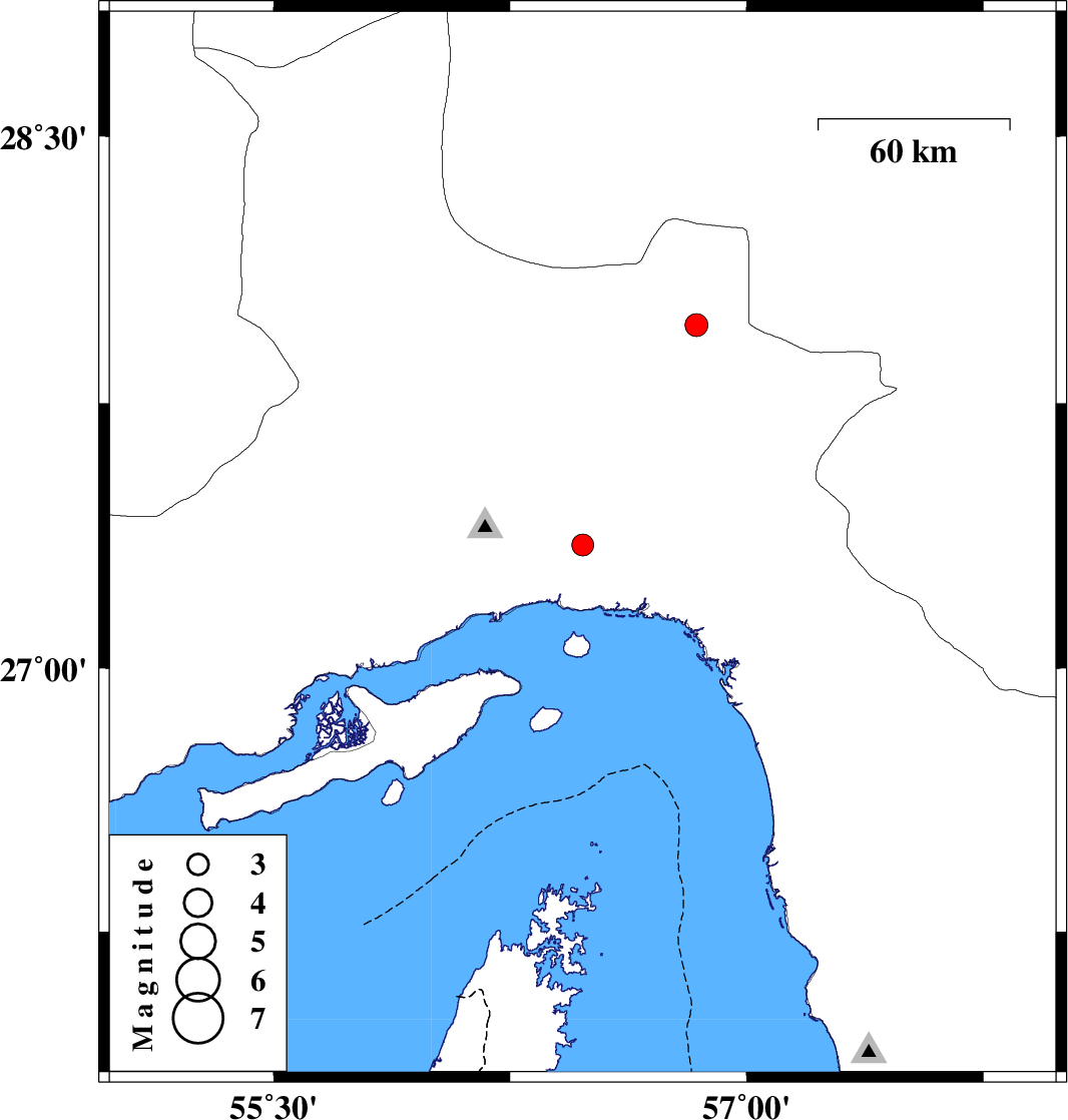 | 2010/10/17 | 16:06:56.6 | 19:36:56.6 | 27.97 | 56.84 | 17 | ML3.3 | Hormozgan Province, 84 km West of Kahnuj |