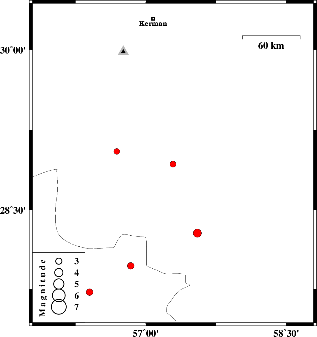 | 2010/09/26 | 07:28:38.6 | 10:58:38.6 | 28.28 | 57.55 | 15 | ML3.9 | Kerman Province, 40 km North-West of Kahnuj | ||