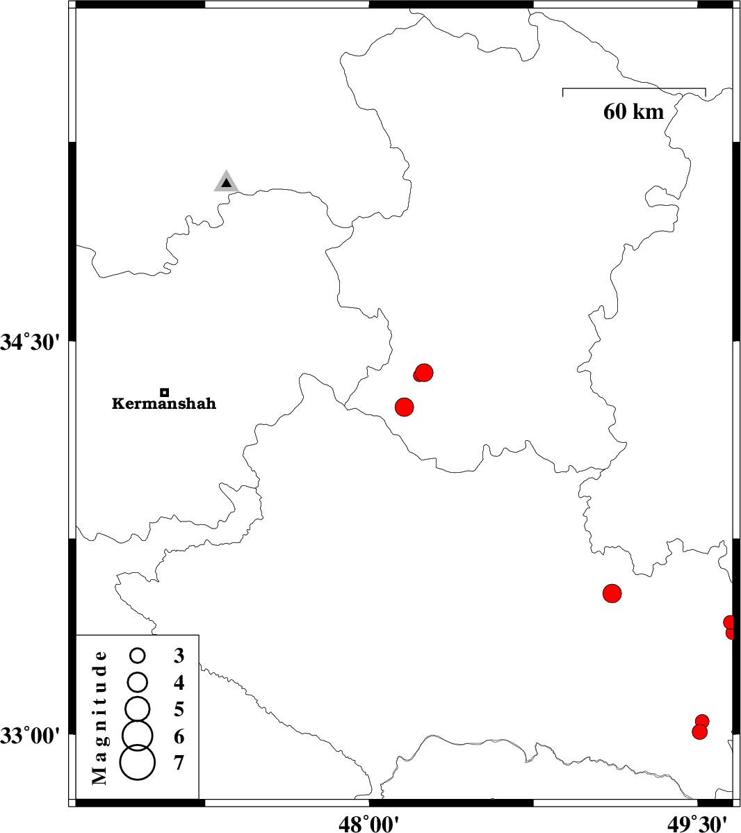 | 2010/10/06 | 07:54:04.1 | 11:24:04.1 | 33.05 | 49.52 | 17 | ML2.8 | Lorestan Province, 46 km South of Azna |