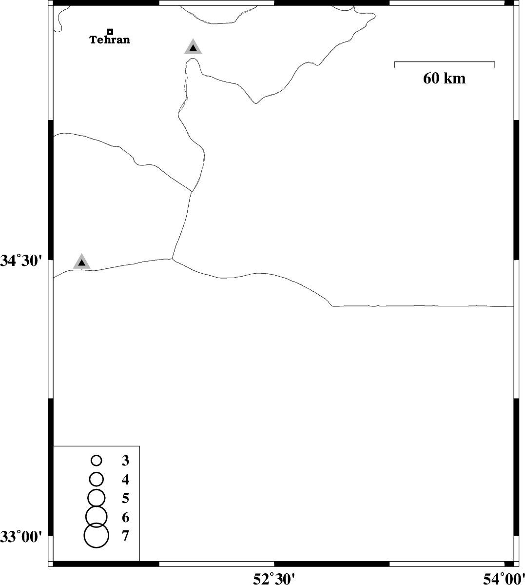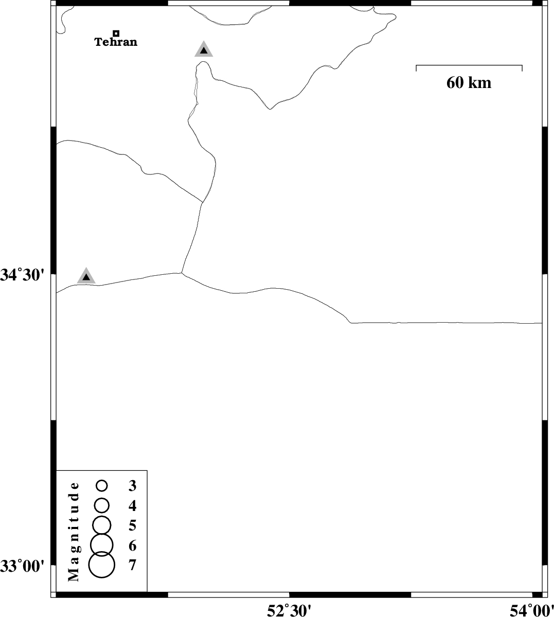 2010/10/26 | 18:58:31.8 | 22:28:31.8 | 34.36 | 52.56 | 37 | ML:2.6 | Esfahan Province, 98 km South-East of Garmsar |