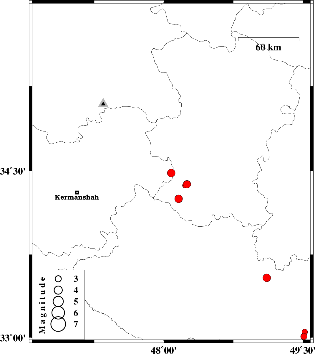 | 2010/10/27 | 15:26:10.6 | 18:56:10.6 | 34.48 | 48.08 | 14 | ML3.8 | Kermanshah Province, 12 km East of Kangavar | ||
