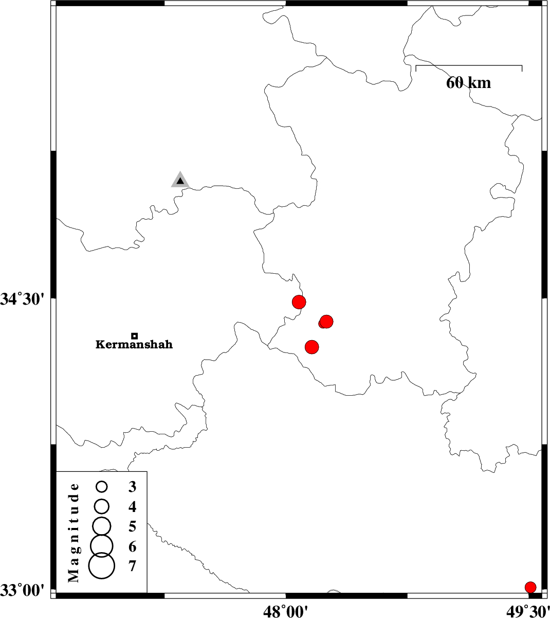 | 2010/10/27 | 15:26:10.6 | 18:56:10.6 | 34.48 | 48.08 | 14 | ML3.8 | Kermanshah Province, 12 km East of Kangavar | ||