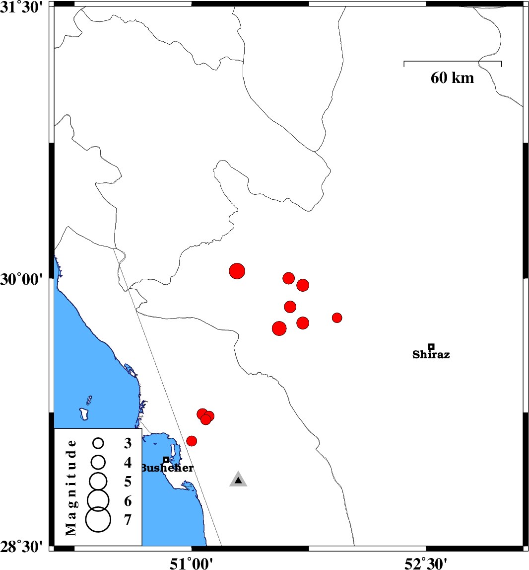 | 2010/10/09 | 00:22:09.8 | 03:52:09.8 | 29.21 | 51.09 | 18 | ML3 | Bushehr Province, 12 km West of Borazjan | ||