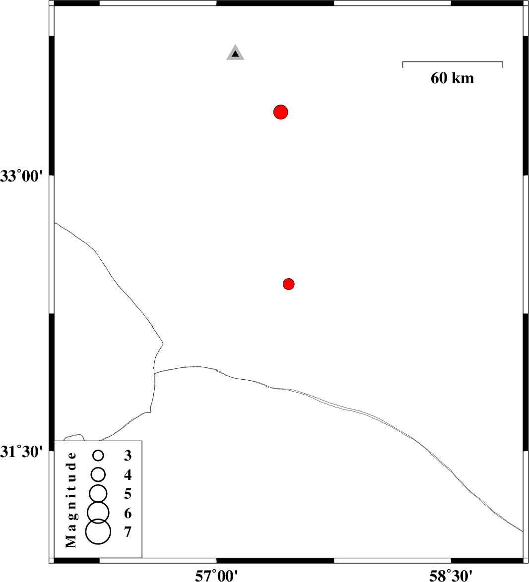 | 2010/10/27 | 18:53:54.3 | 22:23:54.3 | 33.34 | 57.41 | 14 | ML4.1 | Yazd Province, 54 km South-East of Tabas |