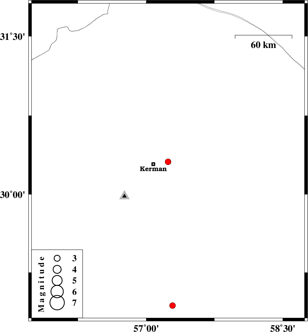 | 2010/10/31 | 16:16:59.7 | 19:46:59.7 | 30.31 | 57.24 | 30 | ML3 | Kerman Province, 16 km East of Kerman | ||