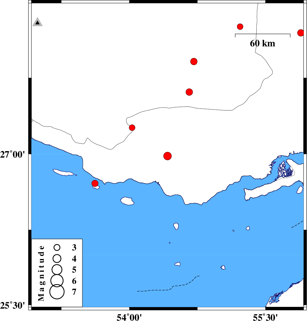 | 2010/11/01 | 08:34:45.3 | 12:04:45.3 | 26.71 | 53.62 | 46 | ML3.3 | Persian Gulf, 83 km South-East of Lamerd | ||