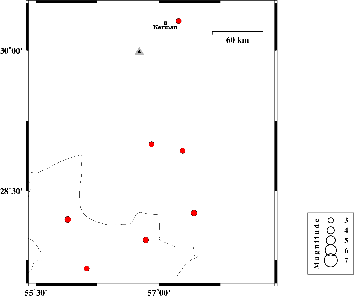 | 2010/10/31 | 16:16:59.7 | 19:46:59.7 | 30.31 | 57.24 | 30 | ML3 | Kerman Province, 16 km East of Kerman | ||