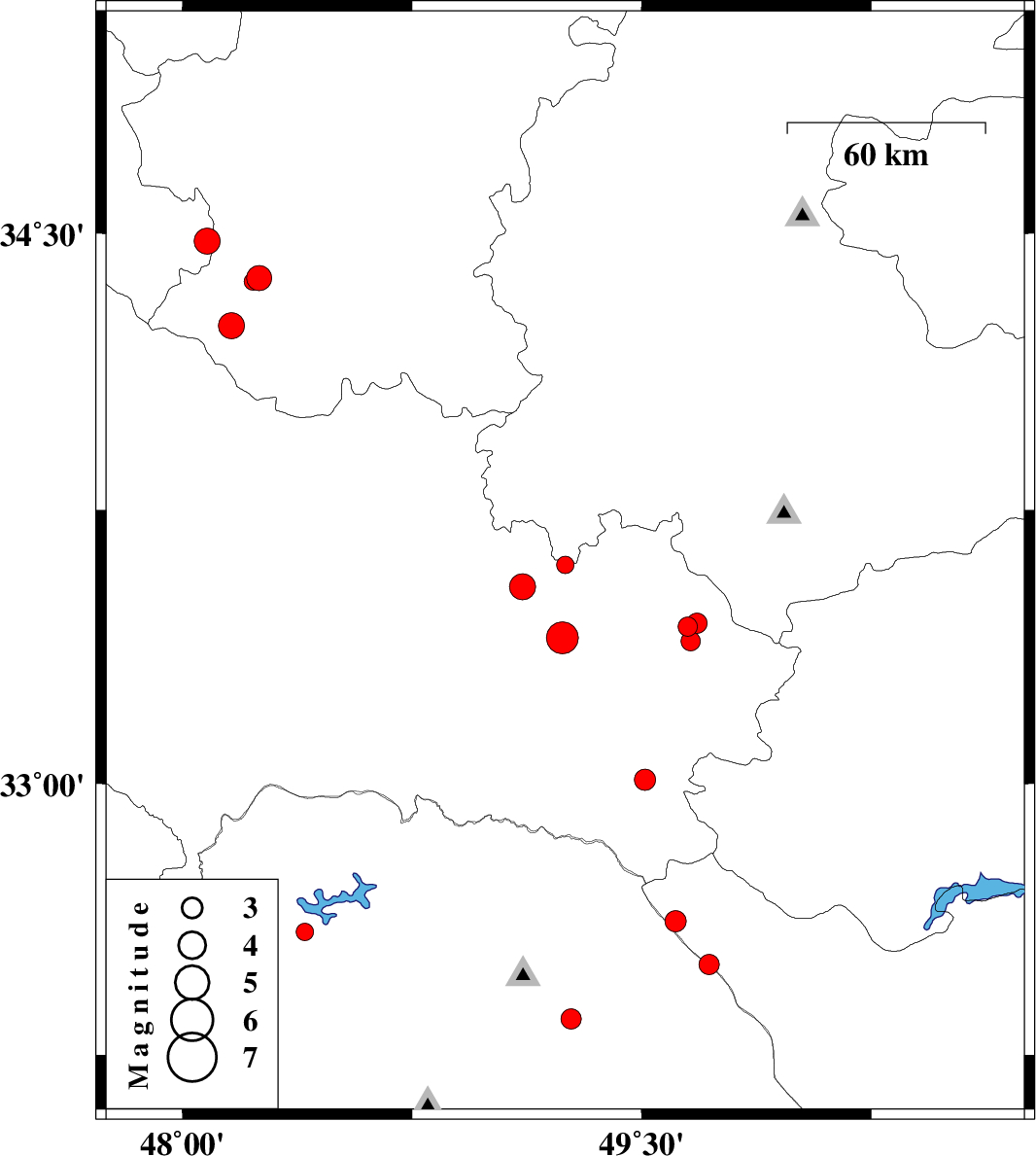 | 2010/10/13 | 02:34:59.4 | 06:04:59.4 | 33.44 | 49.68 | 6 | ML2.9 | Lorestan Province, 4 km Aligudarz | ||