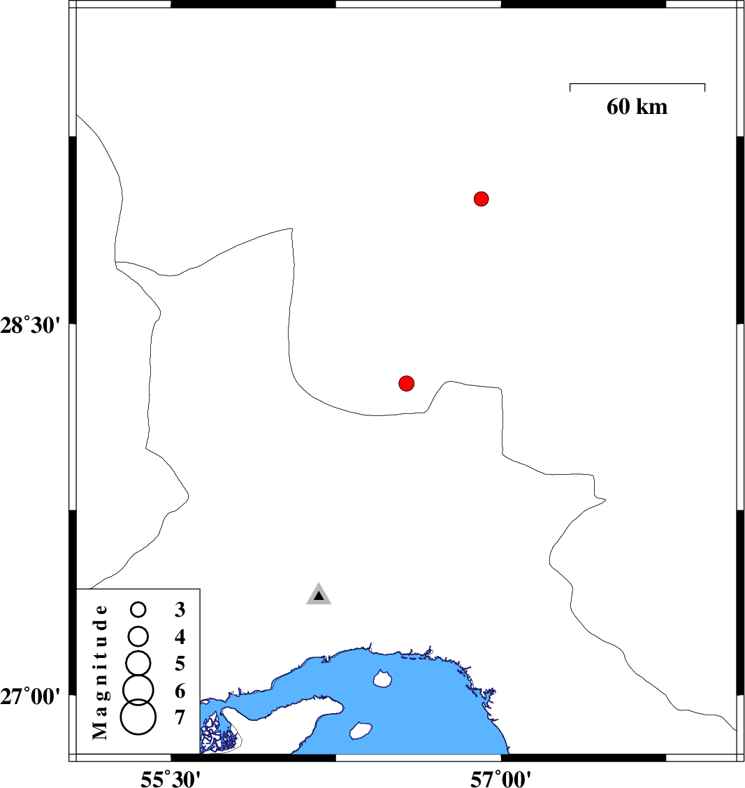 | 2010/11/04 | 18:19:15.6 | 21:49:15.6 | 29 | 56.91 | 14 | ML2.9 | Kerman Province, 40 km South-East of Baft |