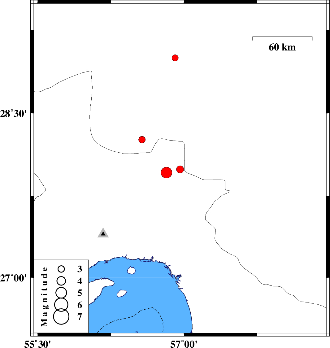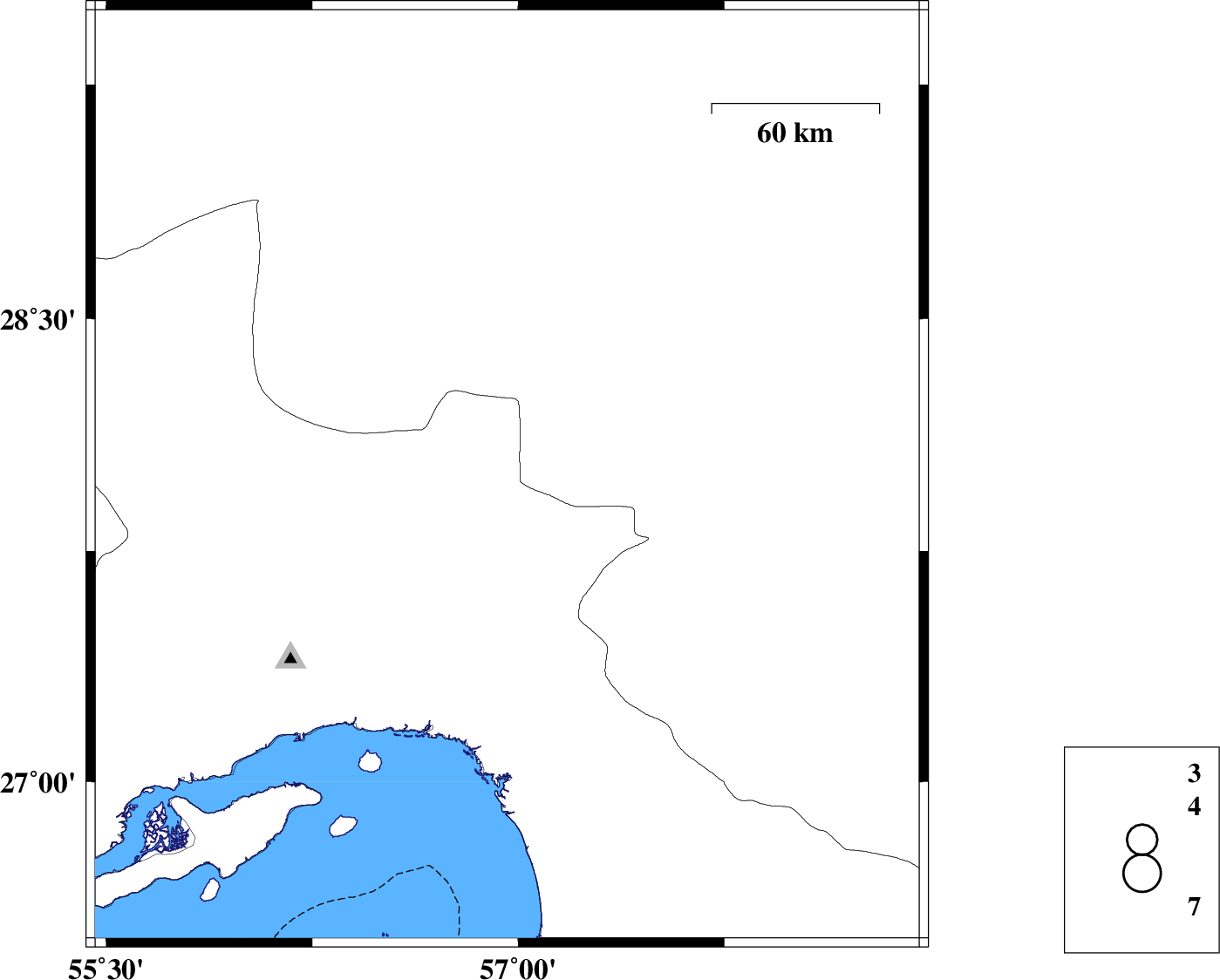 | 2010/11/10 | 13:49:13.4 | 17:19:13.4 | 27.96 | 56.82 | 35 | Mb5.1 | Hormozgan Province, 86 km West of Kahnuj | ||