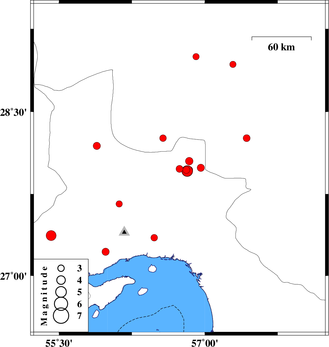 | 2010/10/17 | 16:06:56.6 | 19:36:56.6 | 27.97 | 56.84 | 17 | ML3.3 | Hormozgan Province, 84 km West of Kahnuj |
