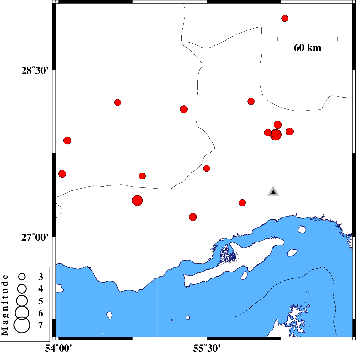 | 2010/10/16 | 10:38:45.9 | 14:08:45.9 | 27.61 | 54.66 | 38 | ML3.4 | Fars Province, 33 km East of Lar |