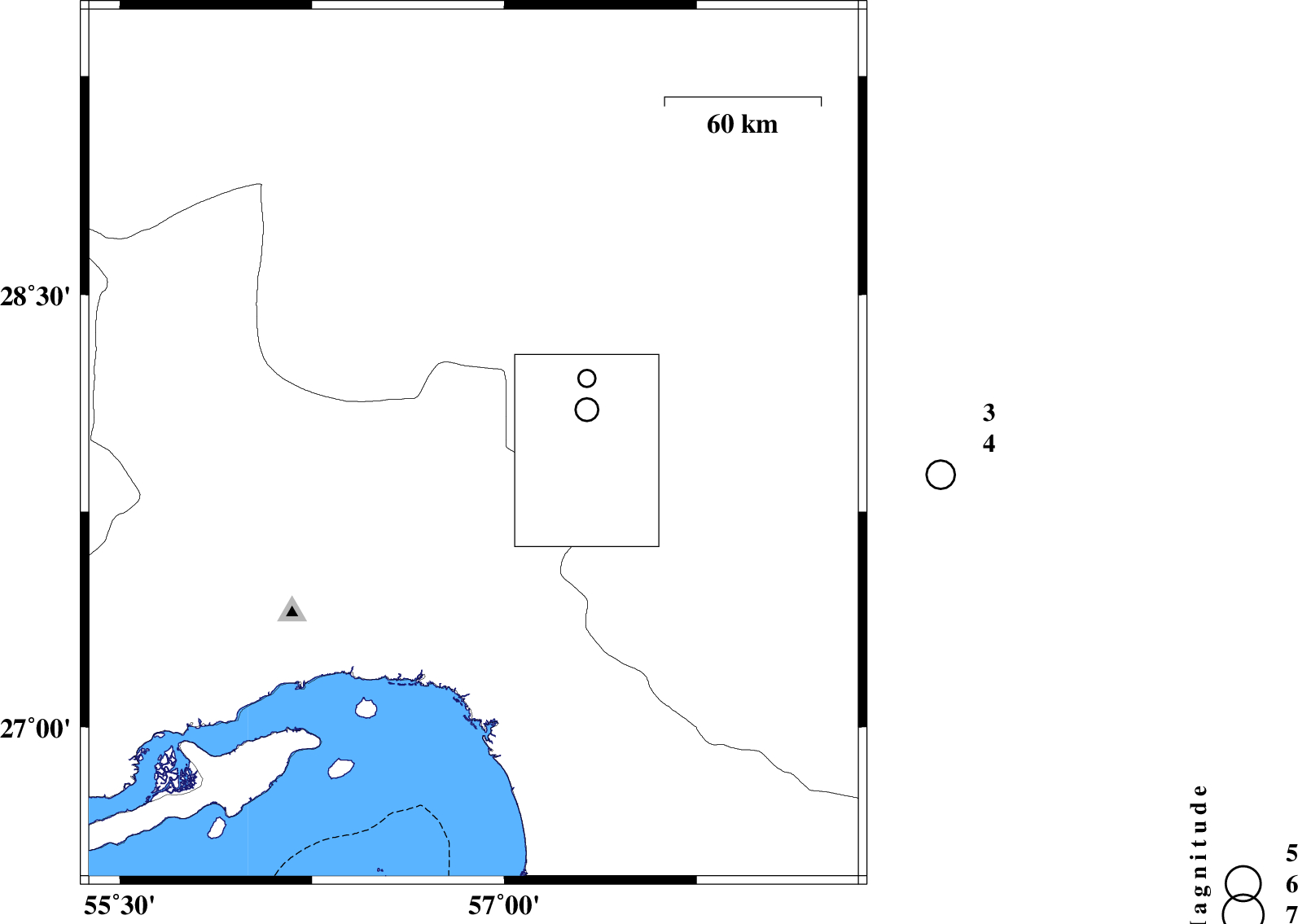 | 2010/11/10 | 13:49:13.4 | 17:19:13.4 | 27.96 | 56.82 | 35 | Mb5.1 | Hormozgan Province, 86 km West of Kahnuj |