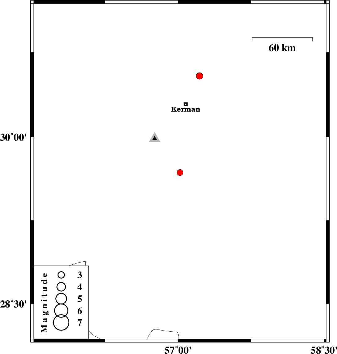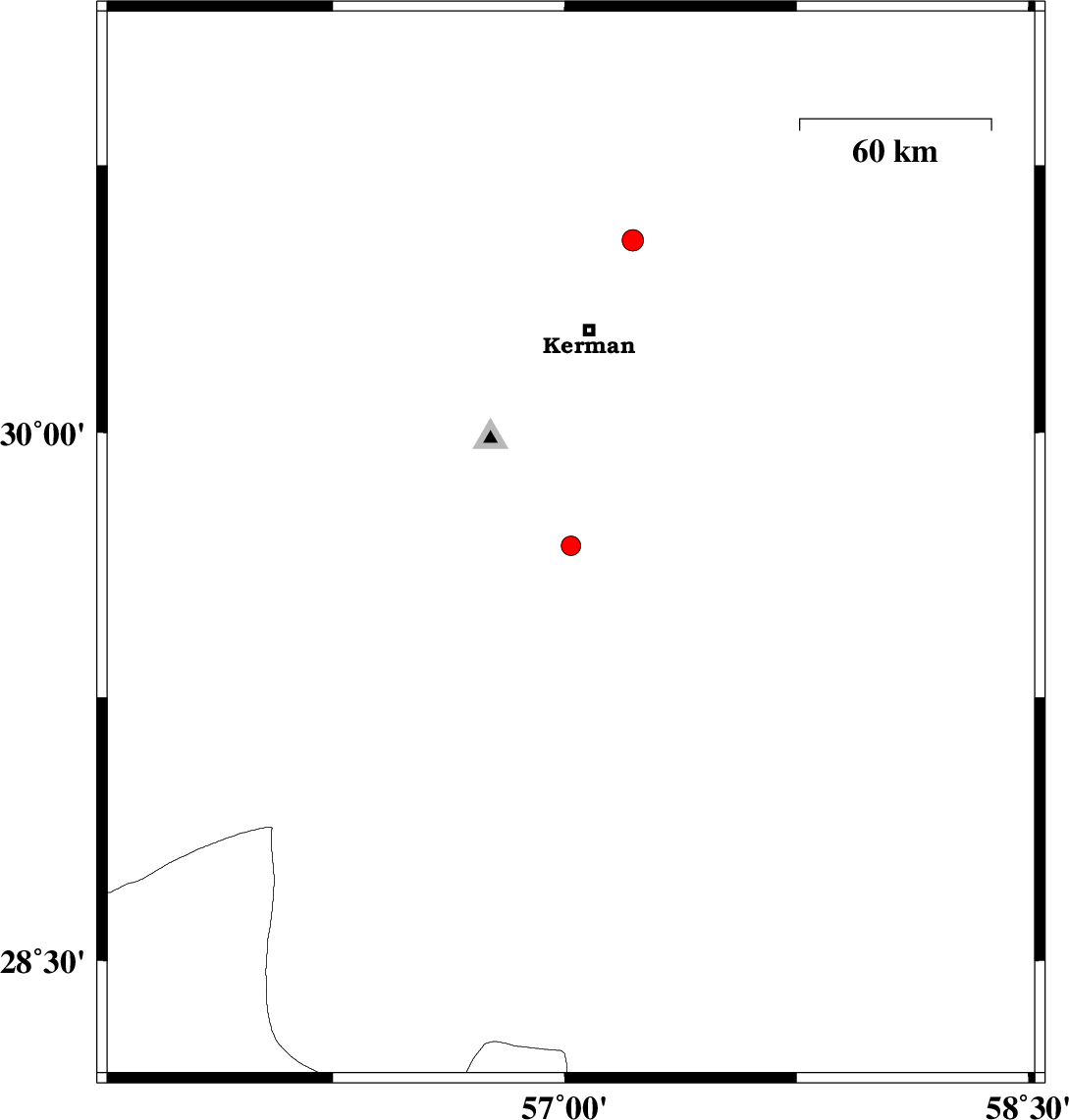 | 2010/11/17 | 16:53:38.7 | 20:23:38.7 | 29.68 | 57.02 | 18 | ML2.8 | Kerman Province, 68 km South of Kerman | ||