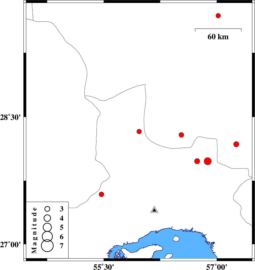 | 2010/11/13 | 05:26:47.1 | 08:56:47.1 | 27.98 | 56.74 | 41 | ML3.2 | Hormozgan Province, 93 km West of Kahnuj |