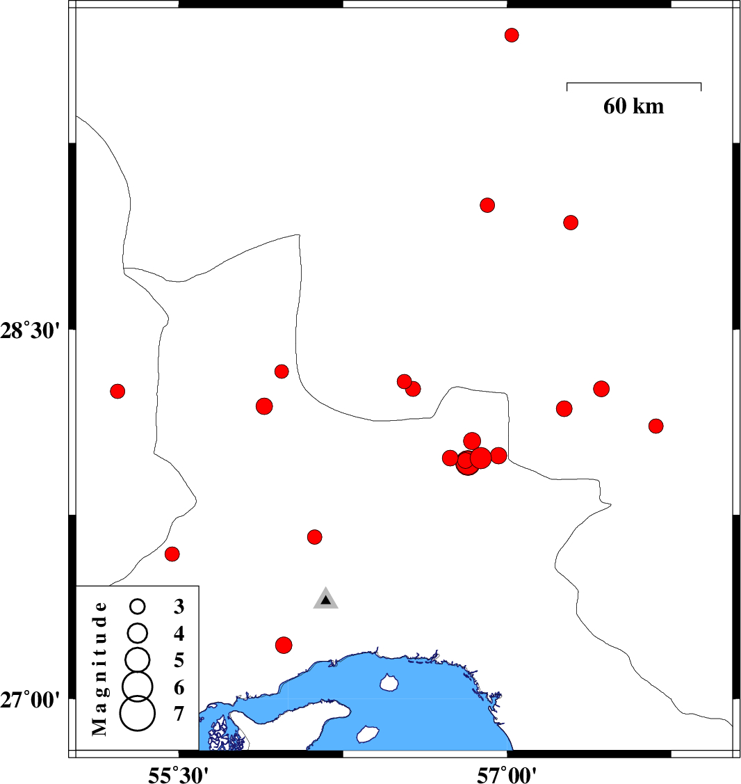 | 2010/11/11 | 13:37:37.6 | 17:07:37.6 | 27.96 | 56.82 | 39 | ML4.8 | Hormozgan Province, 86 km West of Kahnuj | ||