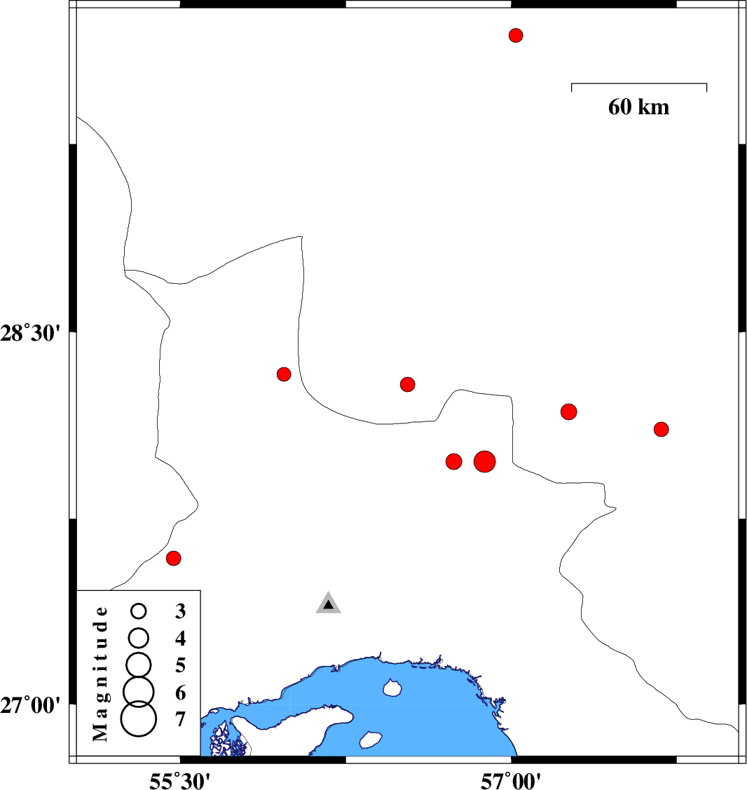 | 2010/11/13 | 05:26:47.1 | 08:56:47.1 | 27.98 | 56.74 | 41 | ML3.2 | Hormozgan Province, 93 km West of Kahnuj |