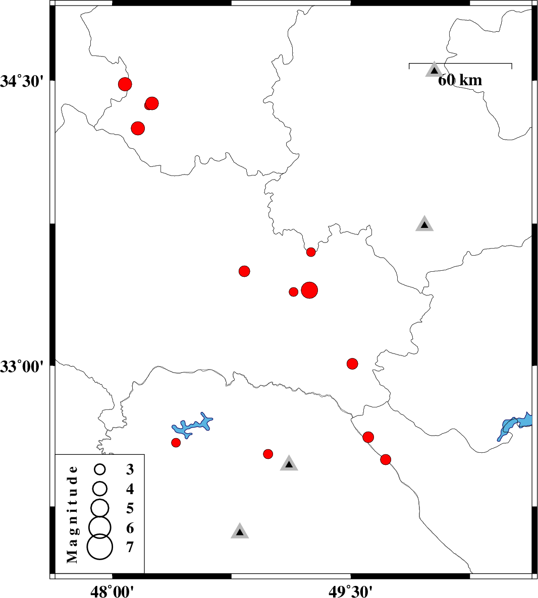 | 2010/10/27 | 15:26:10.6 | 18:56:10.6 | 34.48 | 48.08 | 14 | ML3.8 | Kermanshah Province, 12 km East of Kangavar | ||
