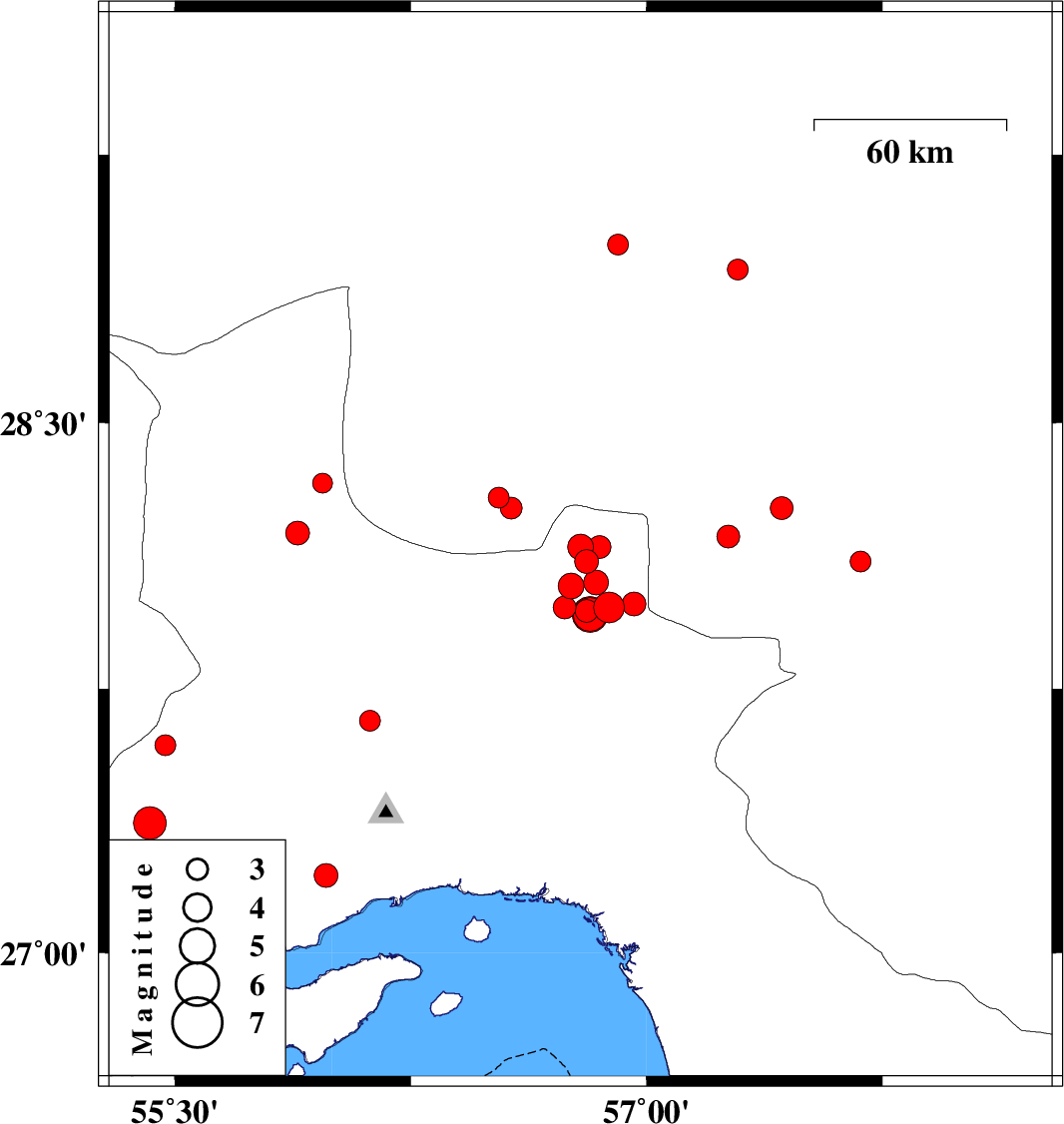 | 2010/11/11 | 13:37:37.6 | 17:07:37.6 | 27.96 | 56.82 | 39 | ML4.8 | Hormozgan Province, 86 km West of Kahnuj | ||