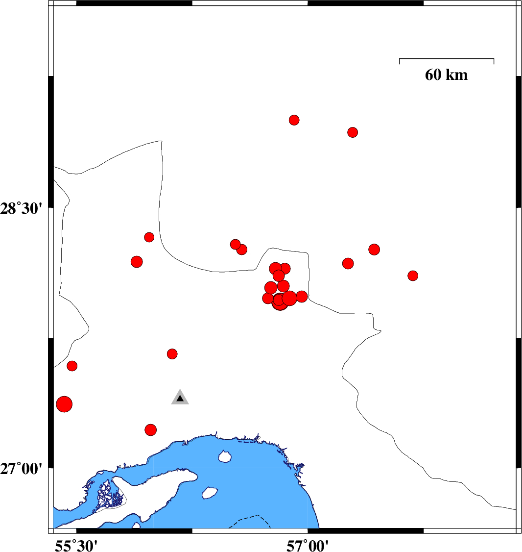 | 2010/11/16 | 13:19:24.4 | 16:49:24.4 | 27.98 | 56.88 | 41 | ML4.4 | Hormozgan Province, 80 km West of Kahnuj | ||