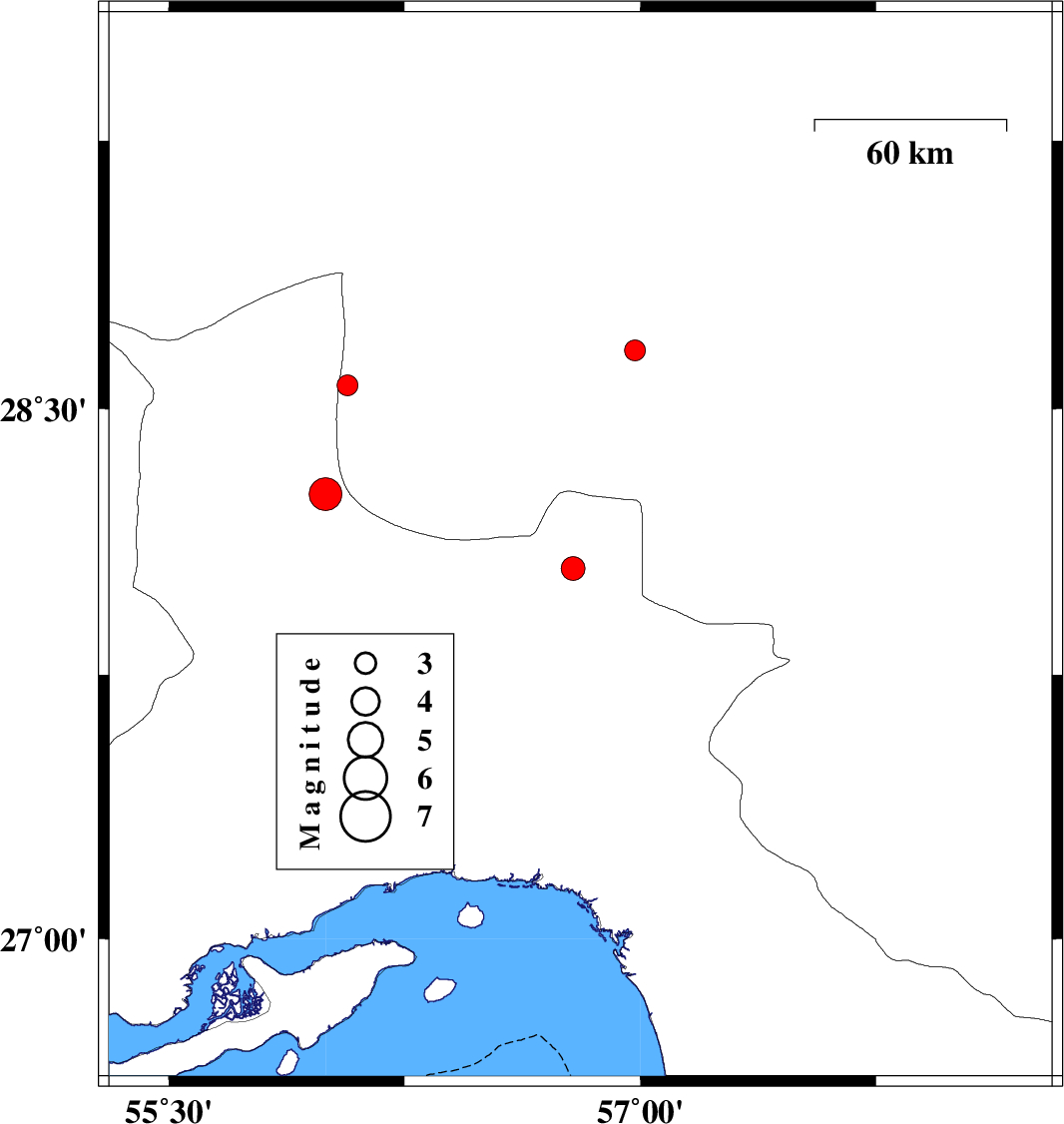 | 2010/11/11 | 13:37:37.6 | 17:07:37.6 | 27.96 | 56.82 | 39 | ML4.8 | Hormozgan Province, 86 km West of Kahnuj | ||