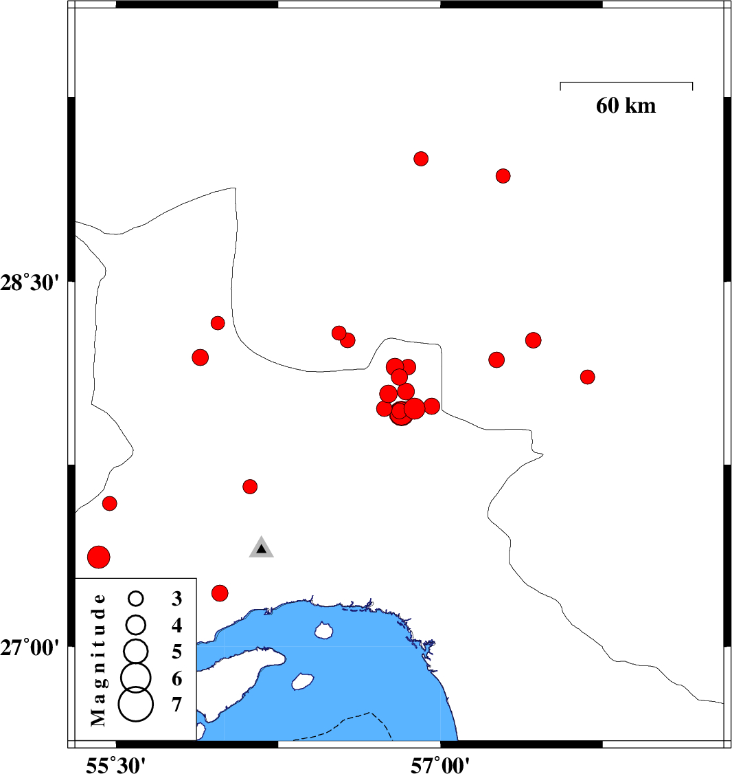 | 2010/11/16 | 13:19:24.4 | 16:49:24.4 | 27.98 | 56.88 | 41 | ML4.4 | Hormozgan Province, 80 km West of Kahnuj | ||