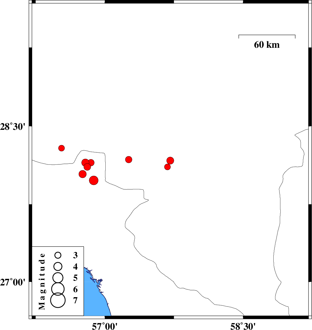 | 2010/11/16 | 13:19:24.4 | 16:49:24.4 | 27.98 | 56.88 | 41 | ML4.4 | Hormozgan Province, 80 km West of Kahnuj |