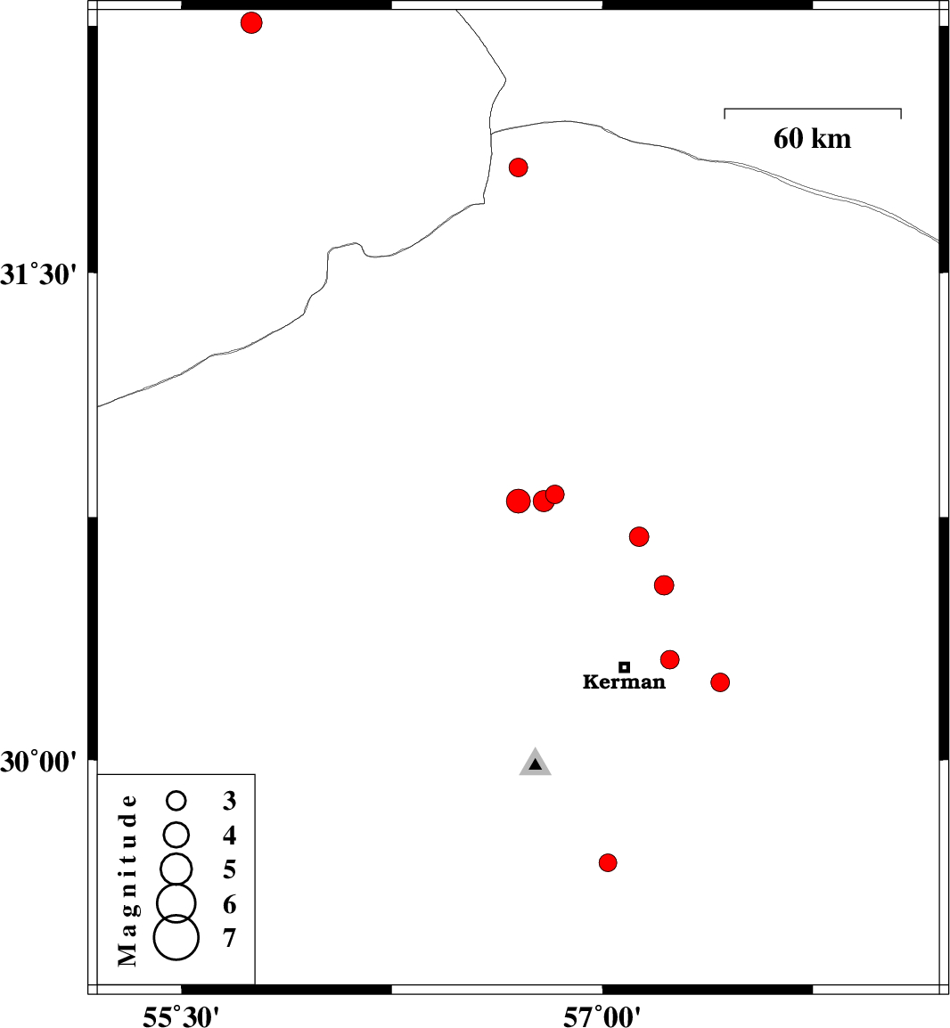 | 2010/10/31 | 16:16:59.7 | 19:46:59.7 | 30.31 | 57.24 | 30 | ML3 | Kerman Province, 16 km East of Kerman |