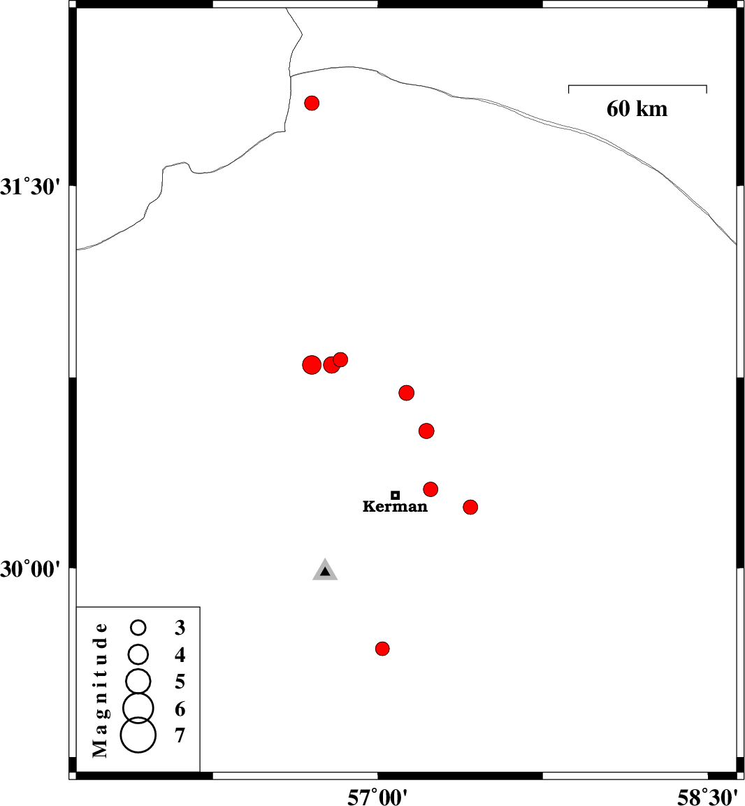 | 2010/10/31 | 16:16:59.7 | 19:46:59.7 | 30.31 | 57.24 | 30 | ML3 | Kerman Province, 16 km East of Kerman |