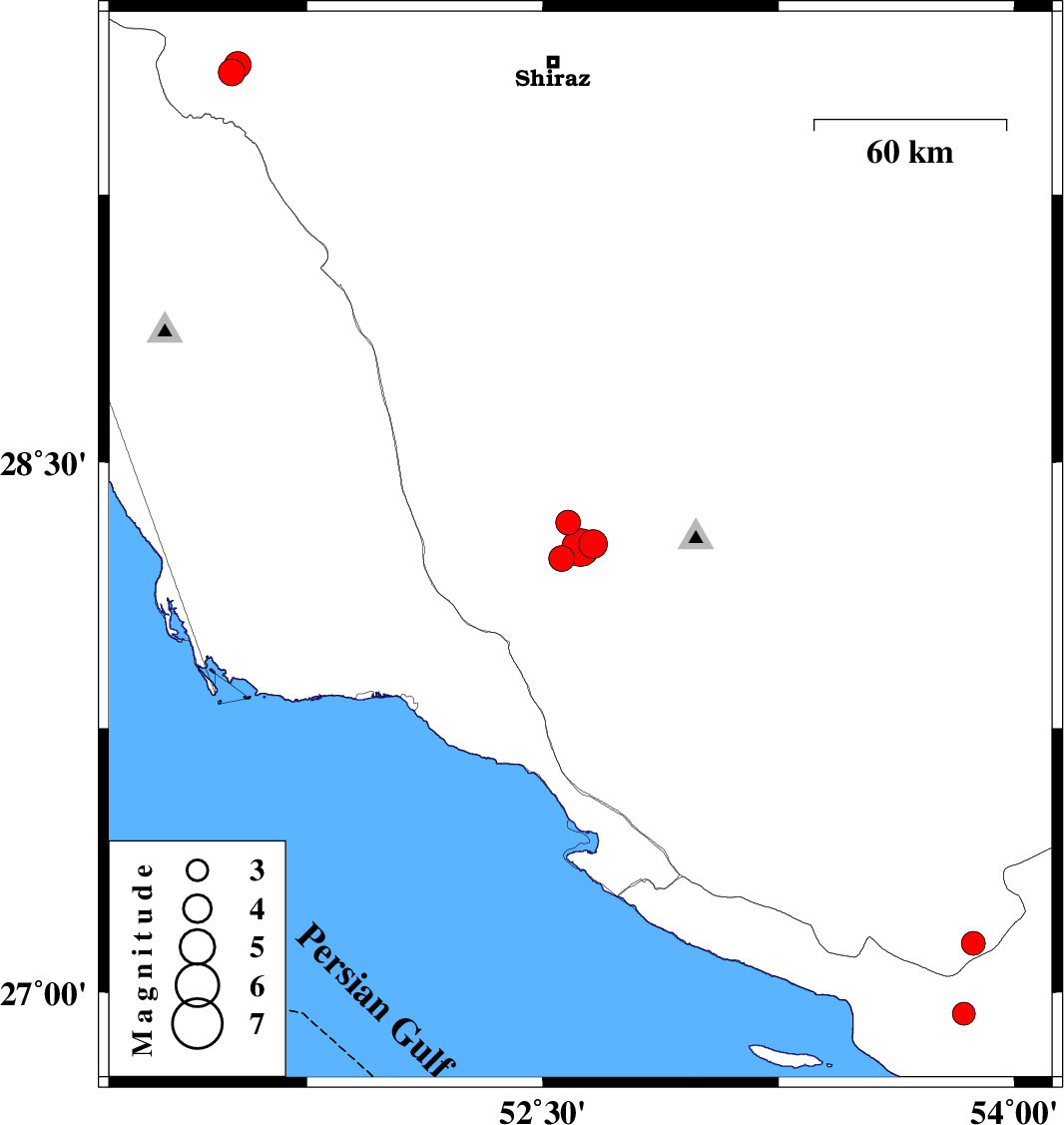 2010/11/26 12:33:44.5 16:03:44.5 28.2652.629 ML5.4 Fars Province, 63 km South of Firuz Abad
